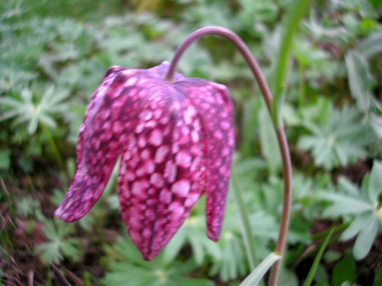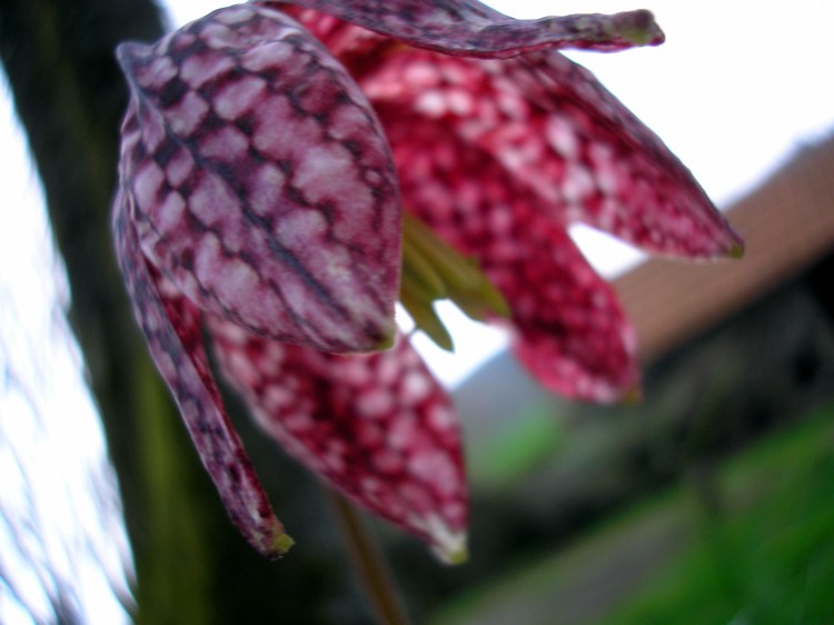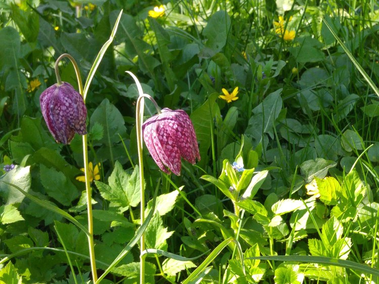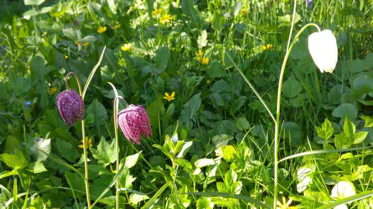 Des fritillaires pintades ont élu domicile chez nous il y a maintenant de nombreuses années. Elles repoussent, chaque printemps ou presque, de leurs bulbes qui péniblement, courageusement, survivent à nos hivers aussi rigoureux que longs. Elles seules savent comment elles sont arrivées à La Montagne, transportées par quel oiseau ou quelle brise estivale. Elles sont d’une certaine manière nos toutes premières hôtes.